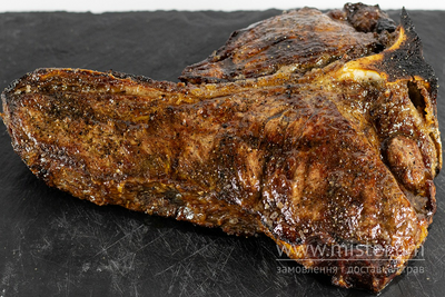 Преміальний вид стейка на Т-подібній кості. Поєднує в собі два різні види м’яса: стейк Нью Йорк, та вирізку філе міньйон. Витриманий за технологією сухої ферментації, відповідно більш насичений в смаку. Кістка додає нотку шкаралупи грецького горіха в ароматі стейка. Готуємо в хоспері.