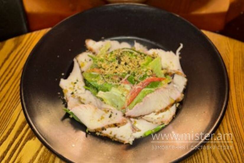 Ніжна індичка в поєднанні зі свіжим міксом зелені, болгарським перцем, хрустким огірком та синьою цибулею. Завершує страву соус айолі з аджикою, оливкова олія та золотистий, хрусткий пангратато.