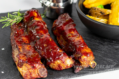 Мариновані сувіджені ребра підсмажуємо в хоспері, подаємо із великою запеченою картоплею та соусом до ребер на томатній основі.