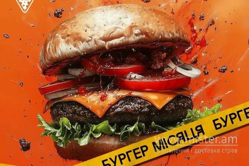 Булка бріош, часниковий соус, бургерний соус, курка, смеш котлета, чедер, помідор, айсберг, цибуля карамелізована.