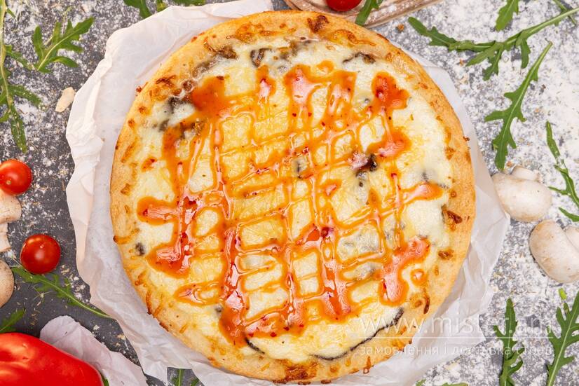 Мікс моцарели та чеддеру, томатний соус, хрусткі шматочки курки, шрірача, перець чилі, томатний соус.