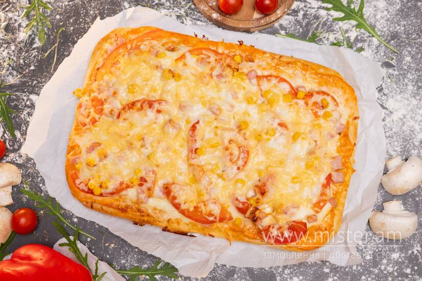 Можна сказати, що така піца, як пекла твоя бабуся в дечкові. Мортадела, кетчунез, моцарела, помідор, кукурудза.