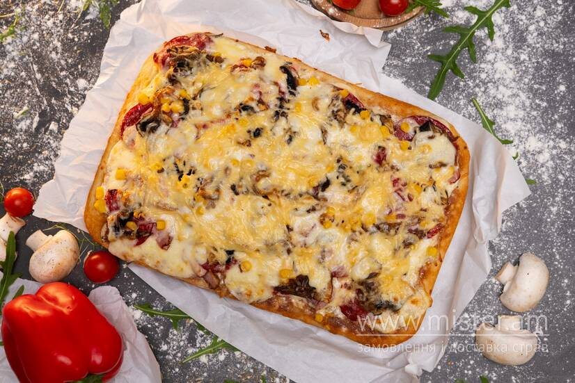Вершковий соус, бочок, салямі, кукурудза, карамелізована цибуля, печериці, мікс моцарели та чеддеру.