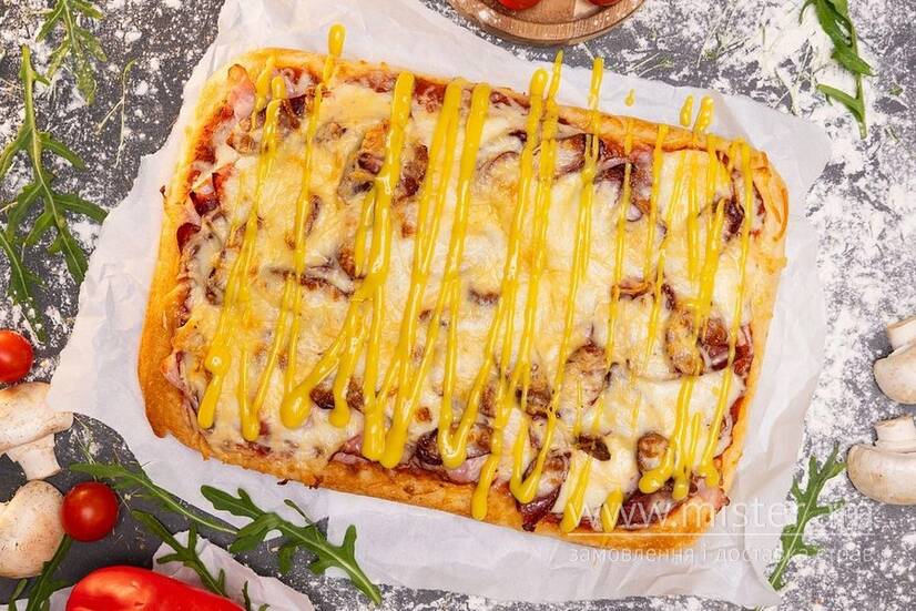Часниковий соус, моцарела, чеддер, бочок, мисливські ковбаски, гірчиця міцна.