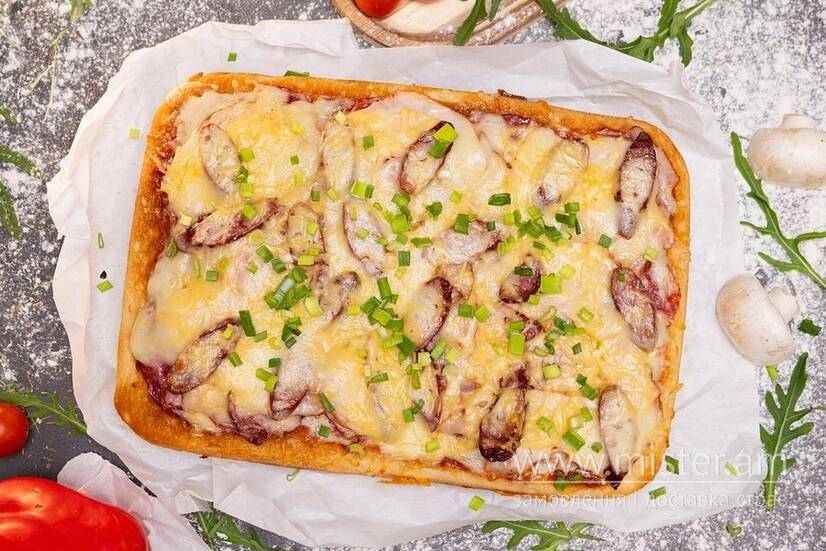 Моцарела, чеддер, вершковий соус, салямі, бочок, шинка, мисливські ковбаски, цибуля зелена.