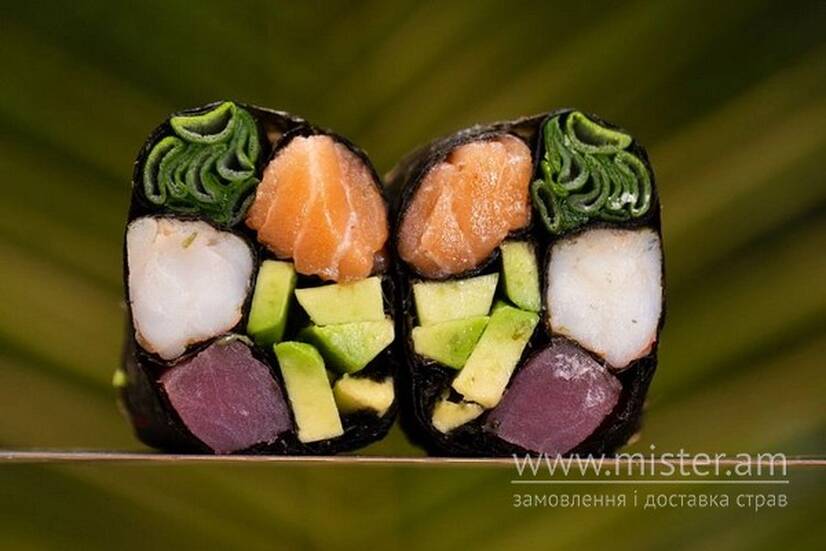 Лосось, тунець, креветка, авокадо, цибуля зелена, норі.
