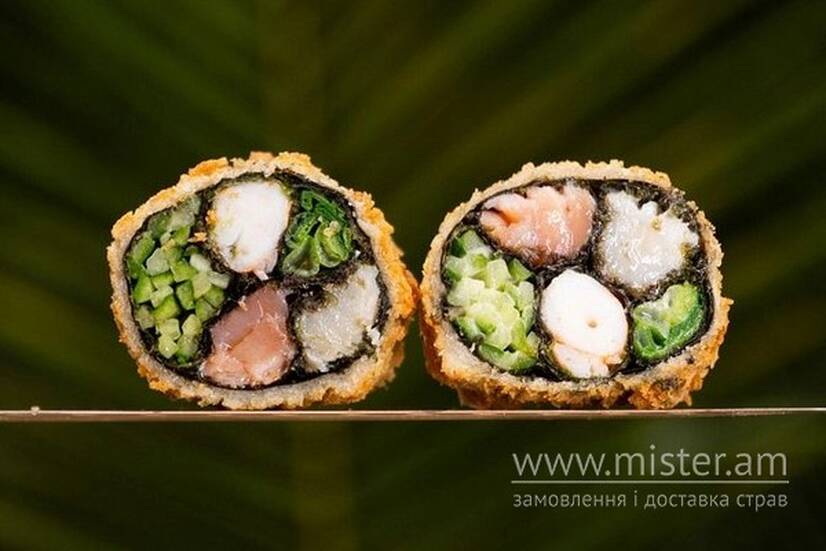 Лосось копчений, масляна копчена, креветка, огірок, зелена цибуля, темпура.