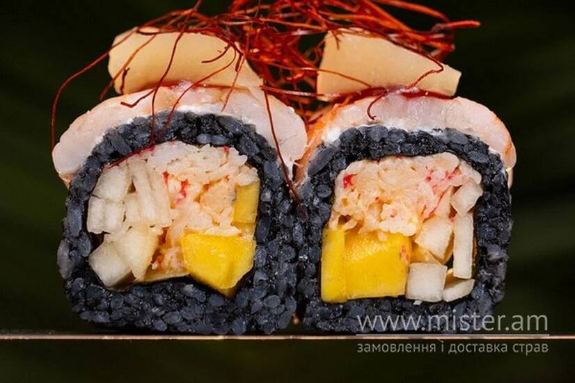 Рис чорний, краб мікс, груша, манго, ананас, креветка, вишневий соус, ниткі чилі, норі.