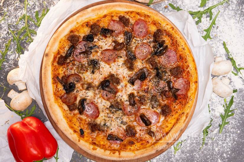 Червоний соус, моцарела, салямі наполі, італійський фарш, печериці барбекю, зелень, італійські трави.
