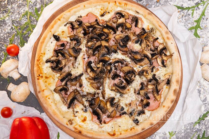 Томатний соус, моцарела, шинка копчена, печериці, часникова олія.