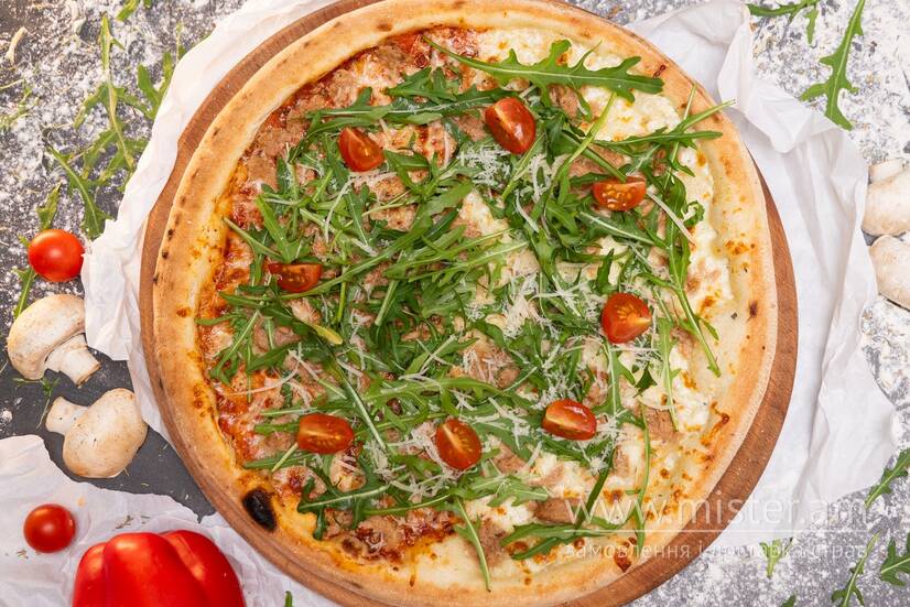 Білий та червоний соус, моцарела, консервований тунець, рукола, спеції, пармезан, італійські трави.