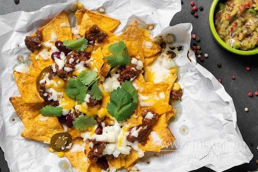Традиційна мексиканська закуска з начо, смаженого фаршу, квасолі, гострого перцю з додаванням цибулі, кінзи та сиру.