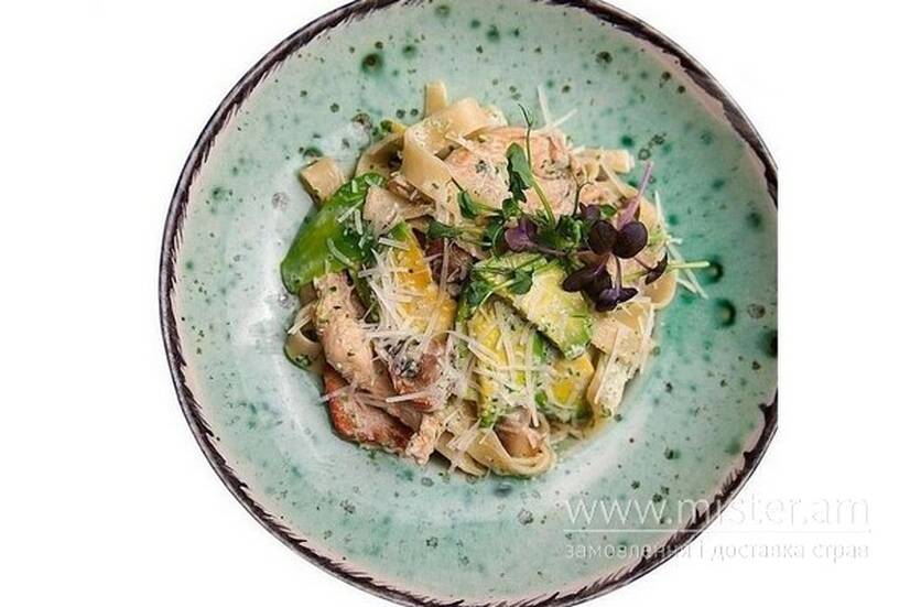 Паста, куряче філе, шпинат, вершки, авокадо, печериці, мікрогрін, пармезан.