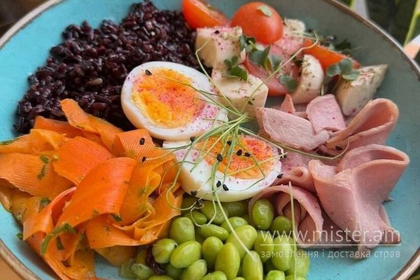 Варений рис, су-від індичка, боби, морква, капрезе з моцарели і чері, варене яйце.