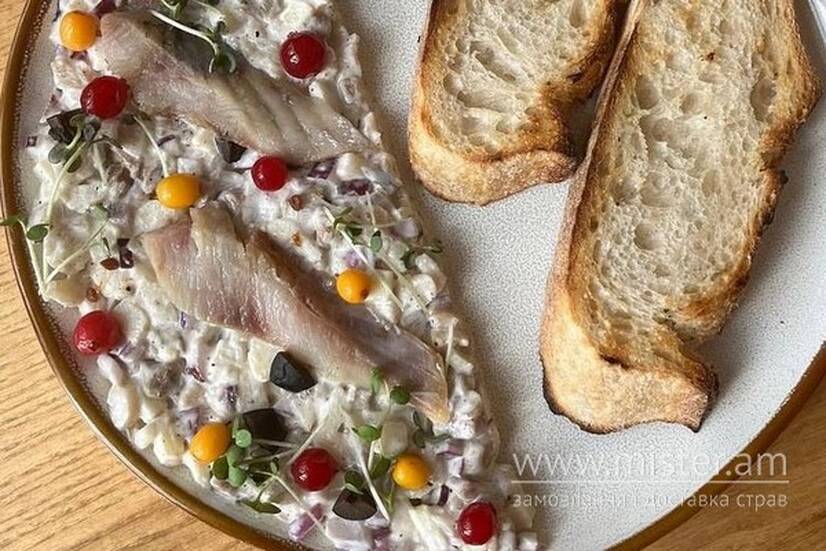 Філе оселедця, вершково - майонезний соус, синя цибуля, яблука.