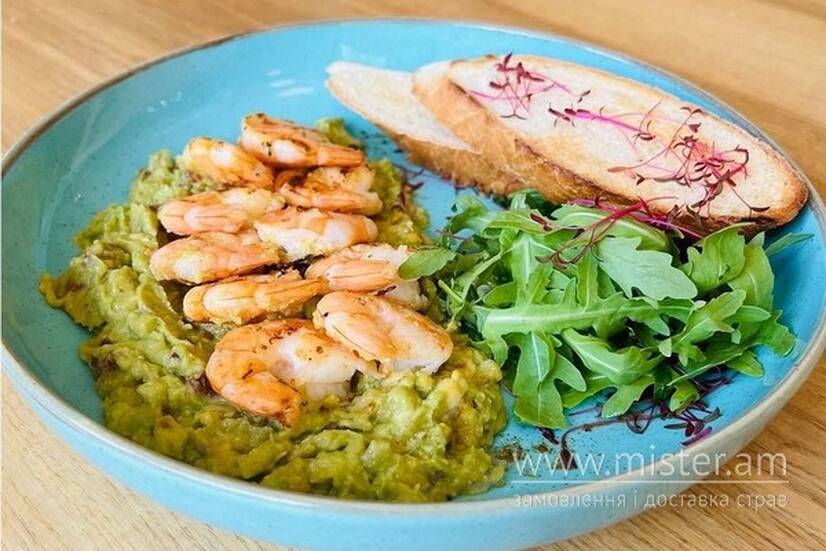 Тигрові креветки грильовані, гуакамоле з авокадо і в'яленими томатами, цибулею та часником під соусом sweet chili, грінки.