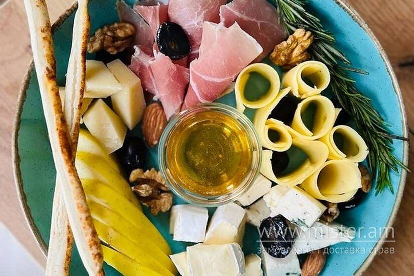 Прошуто, камамбер, дорблю, пармезан, королівський сир, горіхи, ягоди, мед.