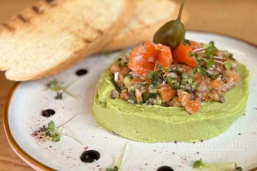 Лосось власного посолу, авокадо, огірок, каперси, цибуля, лимон, грінки.