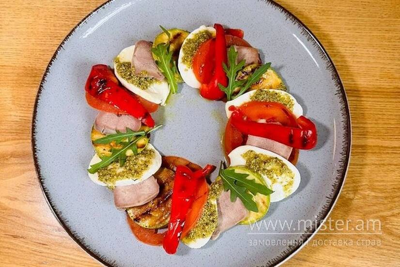 Грильовані кабачки, болгарський перець, помідор, язик, моцарела, соус песто, оливкова олія.