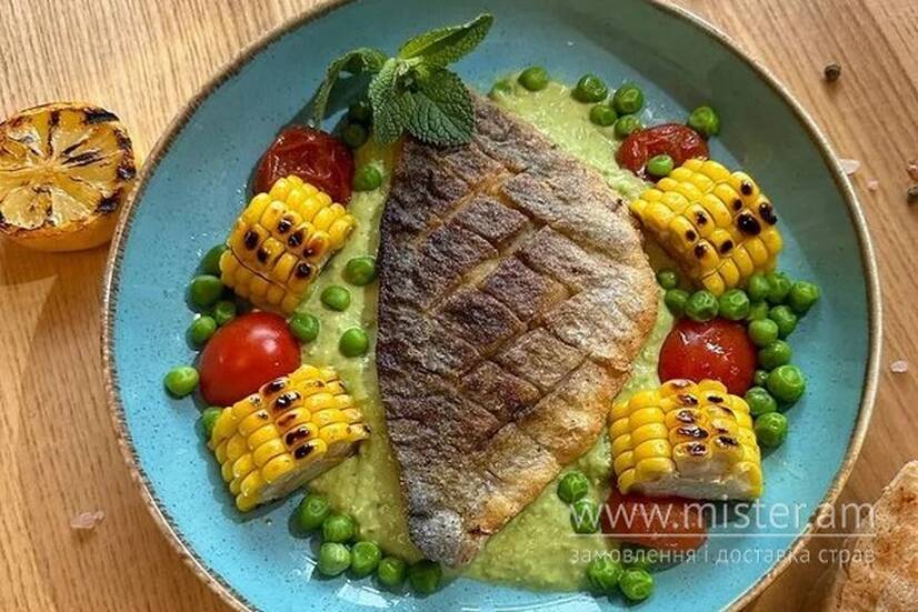 Дородо запечене, зелений горошок, вершки, грильована кукурудза та чері.