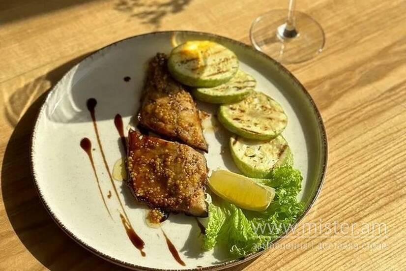 Скумбрія печена, натуральний мед, гірчиця діжонська, грильовані кабачки.