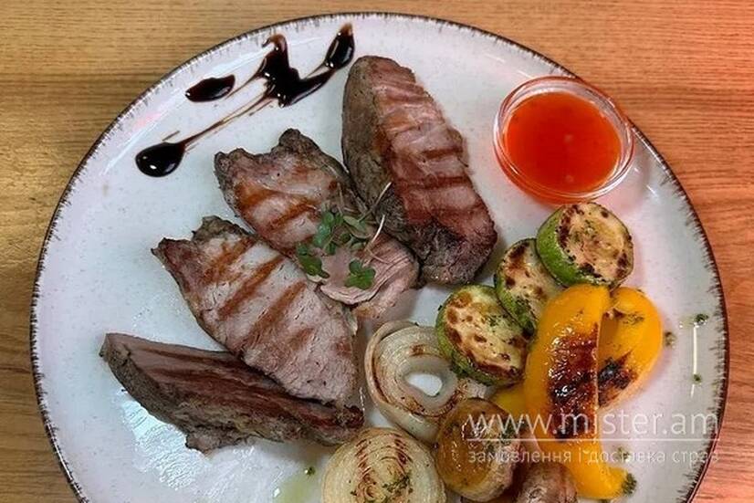 Ошийок зі свинини запечений способом приготування су-від, грильовані кабачок, печериці, болгарський перець, цибуля, соус sweet chili.
