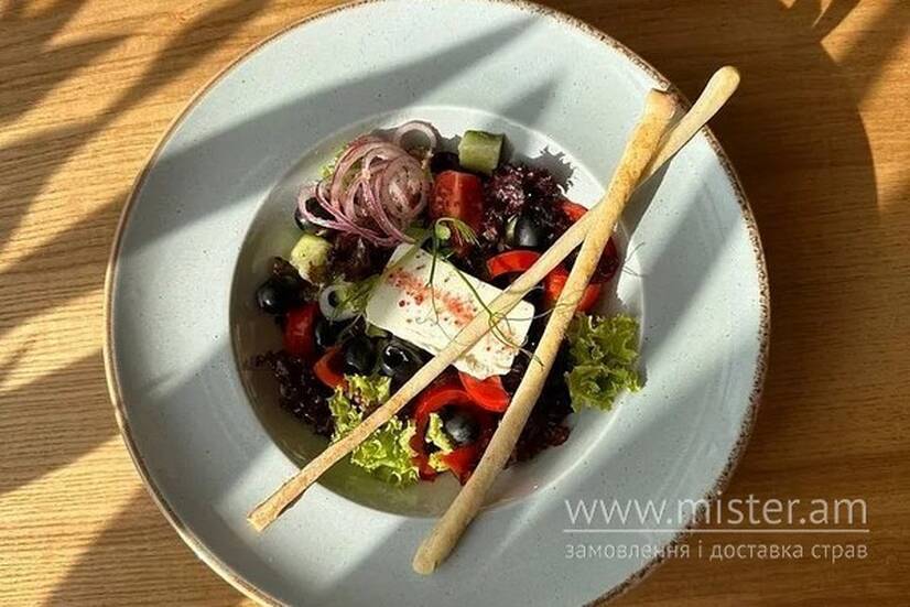 Болгарський перець запечений, фета, огірок, чері, маслини, каперси, мікс салату, синя цибуля, оливкова олія.