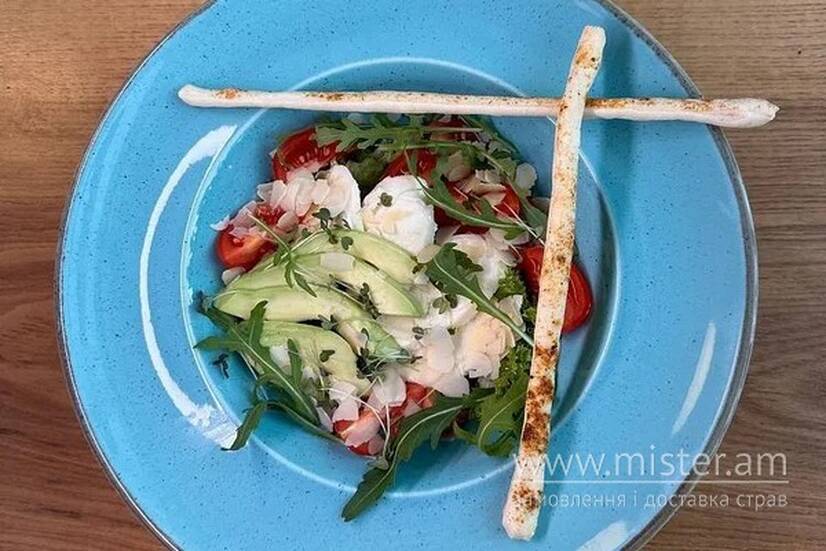 Рукола, моцарела, авокадо, чері, мигдалеві пластівці, діжонський соус, оливкова олія.