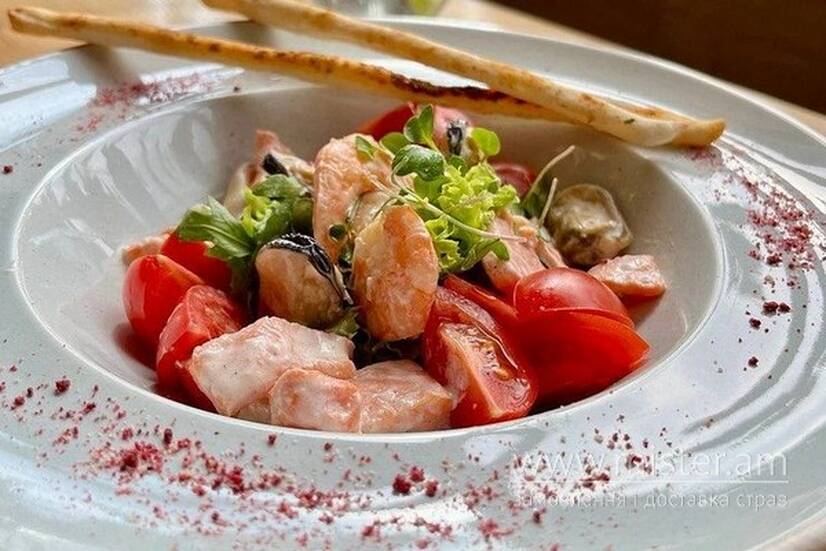 Креветки тигрові, мідії, лосось, чері, мікс салату, вершковий соус, часник, лимон.
