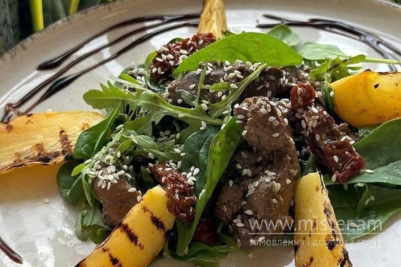 Карамелізована куряча печінка, ківі мариноване, в`ялені томати, шпинат, рукола, кунжут, соус діжонський.