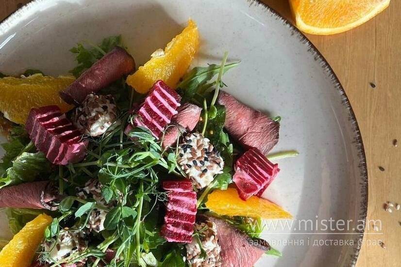 Яловичий ростбіф, фета, філе апельсина, запечений буряк, крем сир, кунжут, шпинат, рукола, листя салату, соус кленовий та діжонський.