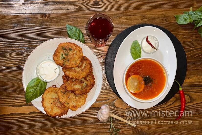 №6 Крем-суп з гарбуза, картопляники з лівером та грибним соусом