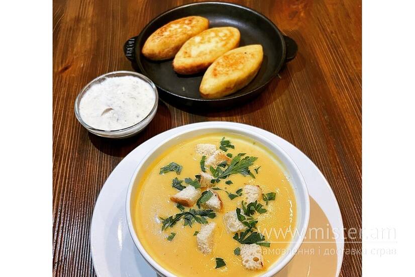 Бар 0,5 №6 Крем-суп з гарбуза, картопляники з лівером та грибним соусом