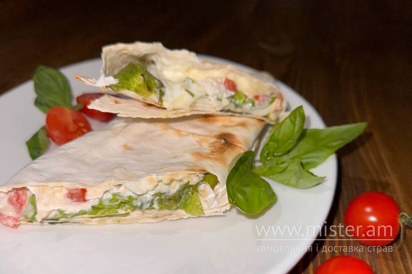 Соус білий, філе куряче, помідор, сир, листя салату.