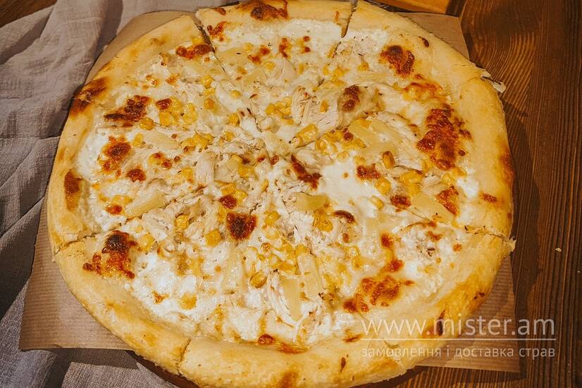 Соус білий, сир, філе куряче, кукурудза, ананас.