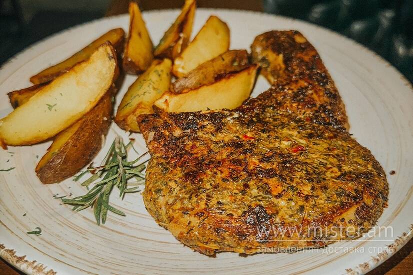 З картоплею по-селянськи та соусом.