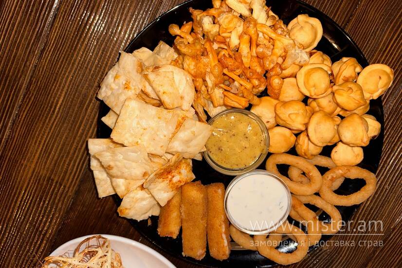 Сирні палички, пельмені фрі, запечений чечель, цибулеві кільця, соус Сезаміно, соус Тартар.