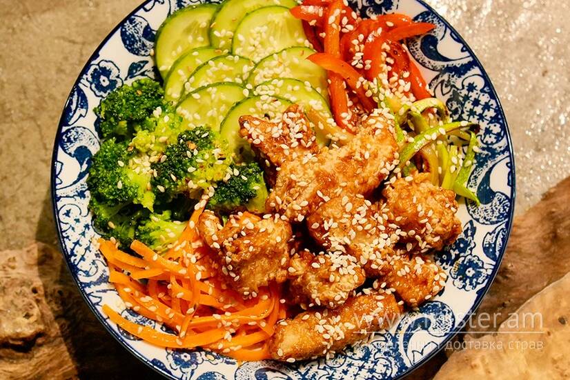 Хрустка курочка, рис, кабачок, болгарський перець, морква, огірок, броколі, кунжут.