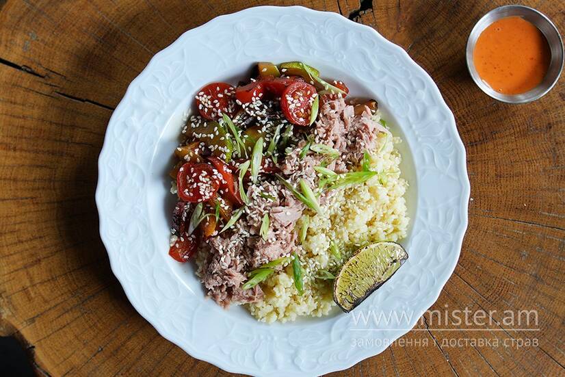 Кускус, тунець консервований, овочеве соте, зелена цибуля, лайм, кунжут, соус шрирача.