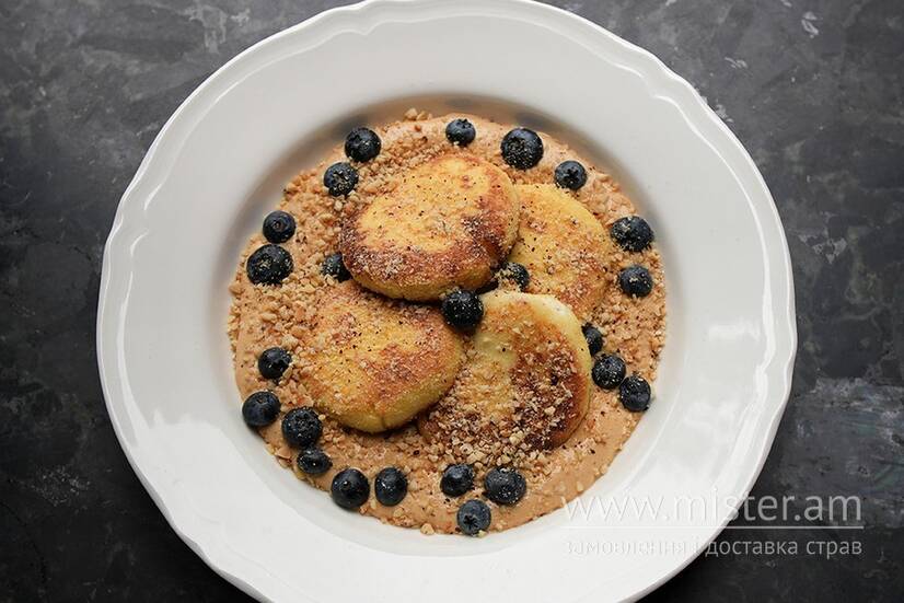 Сирники солодкі, сметана, згущене молоко, ягоди.