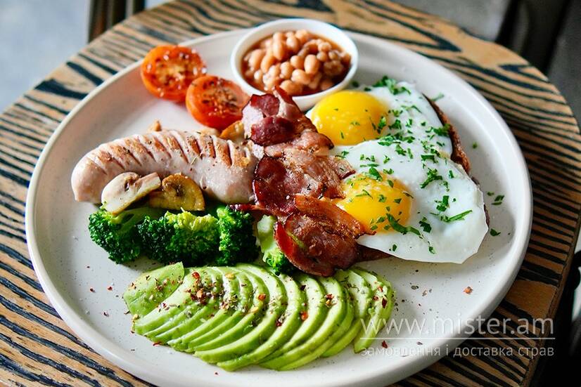 Ковбаска, глазунья, хліб, гриби, броколі, авокадо, бекон, квасоля, помідори чері.