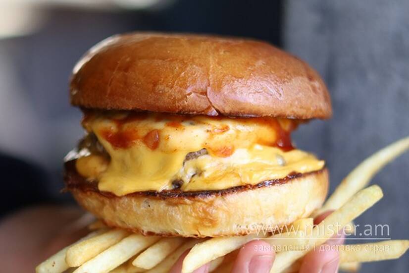 Булка, 2 котлети з яловичини, маринований огірок, цибуля, сир чеддер, соус BBQ. Подається з фрі та соусом.