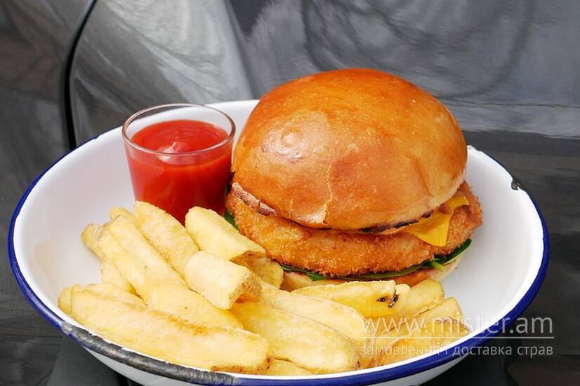Подається з фрі та соусом. Булка, котлета з курятини, шпинат, маринований огірок, бекон, сир чеддер, перець халапеньйо, перець чилі, мед, соуси: BBQ, айолі, шрирача.