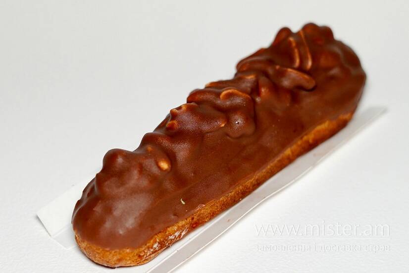 Еклер із заварним кремом снікерс, солоною карамеллю, солоним арахісом та карамельним шоколадом.