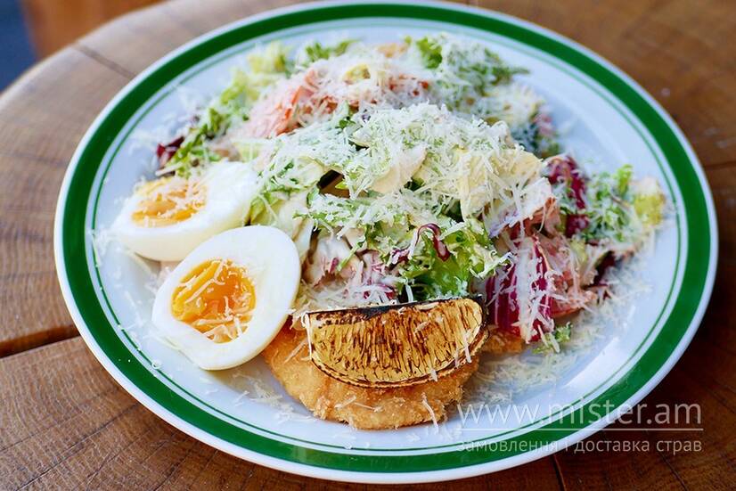 Зелений салат, шніцель курячий, помідор, яйце, сир пармезан, соус цезар.