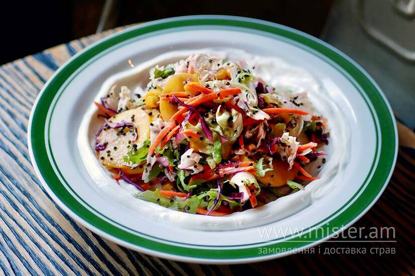 Зелений салат, капуста синя та біла, морква, редис дайкон, кіноа, лабне.