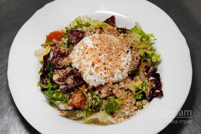 Мікс салату, буряк печений, кускус птітім, помідори чері, мус з фети, горіх грецький.