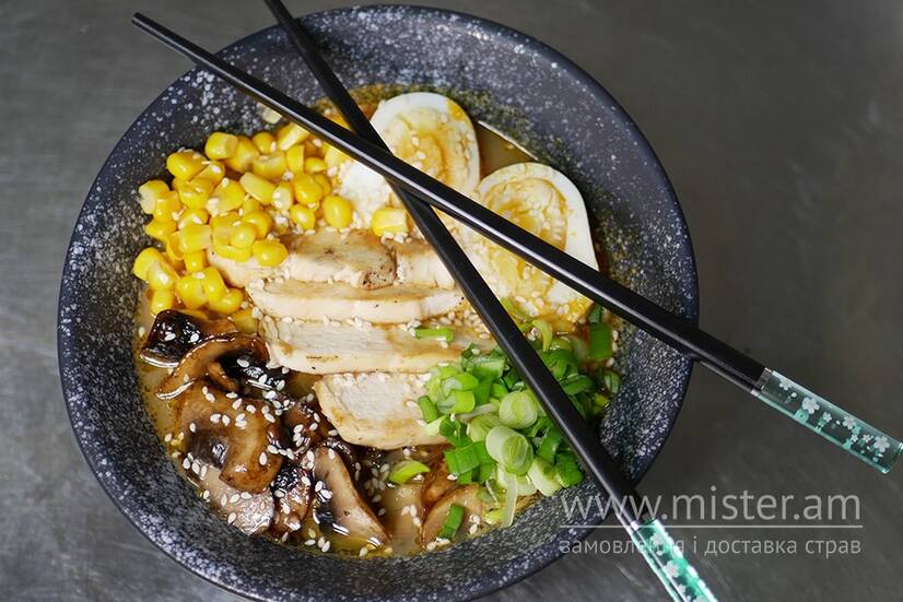 Філе курчати, бульйон азіатський, локшина, гриби печериці, кукурудза, яйце, зелена цибуля, кунжут, соус устричний.