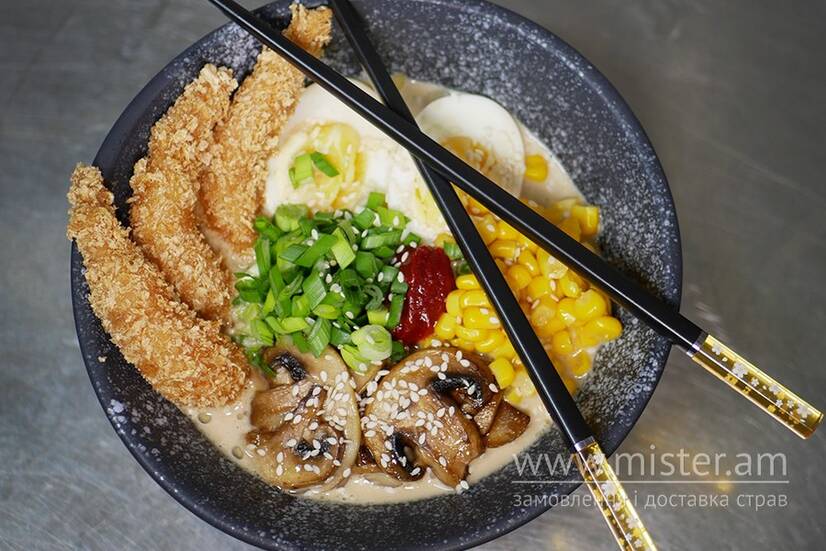 Креветки, бульйон курячий, локшина, гриби печериці, кукурудза, яйце, зелена цибуля, кунжут, соус устричний.
