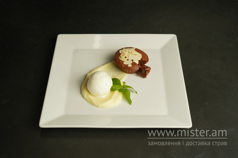 Кекс з чорного шоколаду. Поєднуємо з заварним кремом та кулькою морозива.
